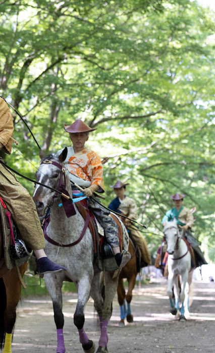 这是为祈祷葵祭游行安全而举行的净化仪式。参赛者骑着马在塔达斯森林(神社参道旁)长达 400 米的跑马场上疾驰,并向三个目标射箭,场面十分刺激。弓箭手射中的目标是“Atotoko”,被视为幸运符。