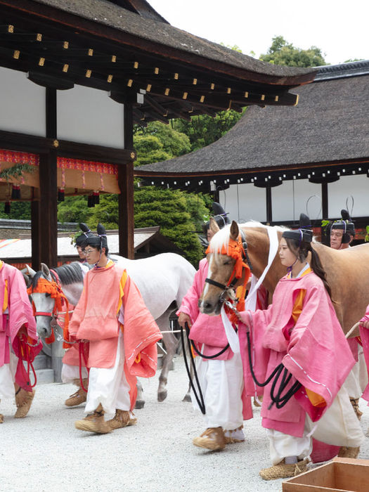 钦差大臣向贺茂神供奉祭品,并诵读祭祀经文。遵循平安时代的古老仪式,表演包括供奉祭品、舞乐舞、东汤和骑马。神社仪式结束后,在忠之森的骑马场上会举行“染之仪”仪式,几匹马会在这里反复奔跑。